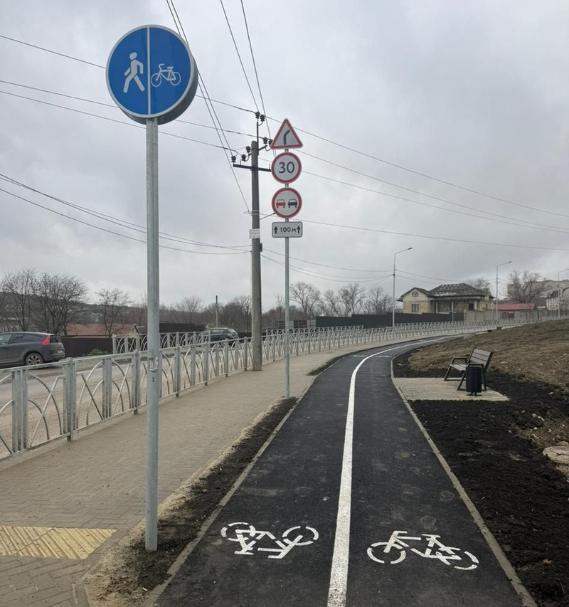 На дороге нанесена разметка, появились зебры, дорожные знаки и ограждение.