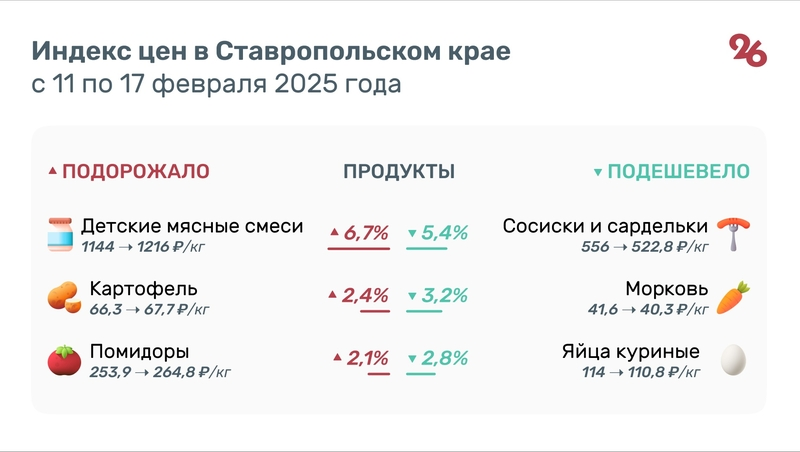 С 11 по 17 февраля в Ставропольском крае на 2,2% подорожал картофель — 67,7 руб. за кг. На 2,1% стали дороже помидоры — 259 руб. за кг. Цена бананов выросла на 1,8% — 188,5 руб. за кг.