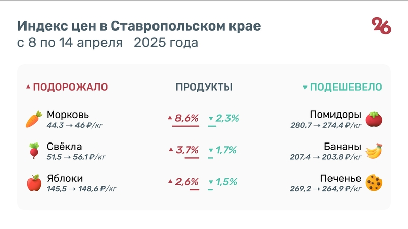 С 8 по 14 апреля свекла подорожала на 8,6%. Её цена увеличилась с 51,5 до 56,1 руб. за кг. Стоимость моркови выросла на 3,7%: с 44,3 до 46 руб. за кг.