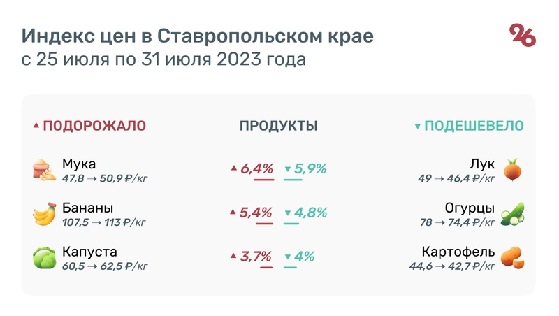 За неделю на 6,4% на Ставрополье выросла стоимость муки — 50,99 руб. за кг. Бананы подорожали на 5,4% — 113,10 руб. за кг, а цена капусты и свёклы увеличилась на 3,7% — 62,47 и 40,52 рублей за кг соответственно.