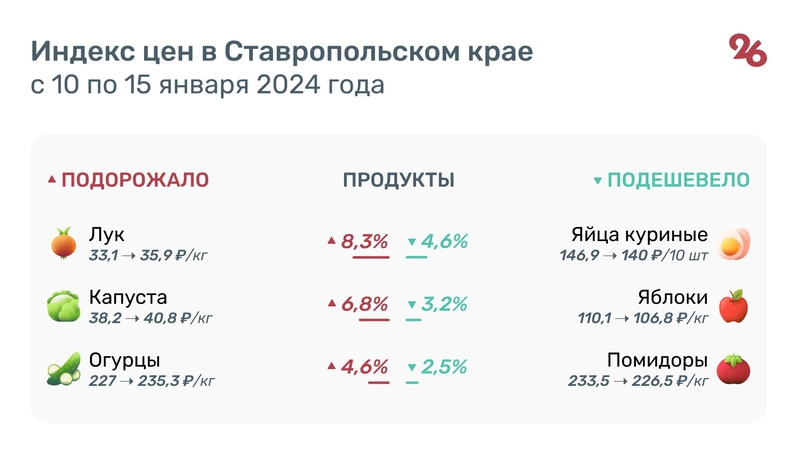 За неделю в Ставропольском крае на 4,6% подешевели яйца: стоимость десятка снизилась до 140 рублей. На 3,2% упала цена на яблоки — 106,8 руб. за кг. На 1,5% в крае стали дешевле охлаждённые куры и пшено. Их цена составила 222,9 и 48,7 руб. за кг соответственно.