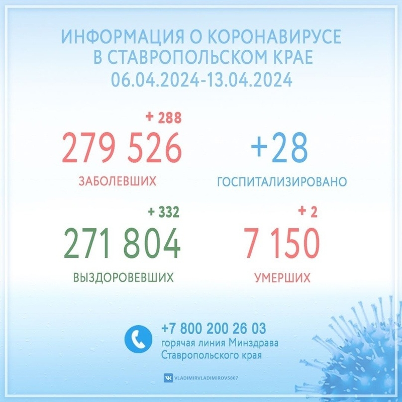 По данным главы региона, в период с 6 по 13 апреля на Ставрополье было зарегистрировано 288 заболевших COVID-19, 332 — выздоровевших. Среди детей — 19 и 17 человек соответственно.