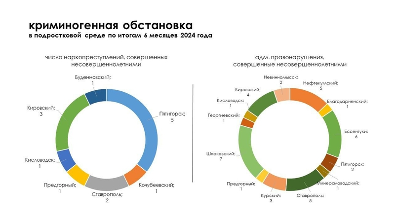 При этом в крае снизилось количество наркопреступлений среди несовершеннолетних. В ряде муниципалитетов такие случаи удалось свести к нулю. Негативный всплеск зафиксировали в Пятигорске — там несовершеннолетние совершали преступления, связанные с запрещёнными веществами, на 67% больше. На 20% выросло в крае число подростков на учёте в наркологии.