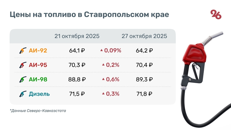 С 21 по 27 октября на рынке топлива региона зафиксировано незначительное повышение цен. Стоимость бензина АИ-92 выросла на 0,09% — с 64,1 до 64,2 руб/л, АИ-95 подорожал на 0,2% — с 70,3 до 70,4 руб/л. АИ-98 стал стоить 89,3 руб/л. Рост составил 0,6%.