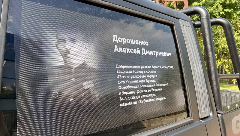 «Дед, Дорошенко Алексей Дмитриевич, с первого дня работал председателем колхоза. Началась война, и он добровольно ушёл на фронт. Вернулся 30 мая 1945 года. А на ещё одном автомобиле мы разместили портрет моего тестя. Иван Петрович Сулима — тоже участник Великой Отечественной войны»,