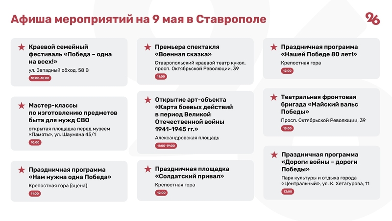 В 12:00 на Крепостной горе выступит Сводный (тысячеголосый) детский хор «Поющая юность Ставрополья». В это же время праздничная программа «Вместе празднуем Победу» (0+) стартует на Владимирской площади. Мероприятия продлятся до 20:30. Завершится день концертом группы «ПослеZавтра» и выступлением певицы из Донецка Натальи Качуры и светомузыкальным шоу на фонтане «Россия».