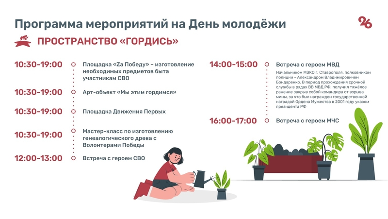В пространстве «Гордись» гостям помогут изготовить генеалогическое древо своей семьи. В 14:00 молодёжь будет ждать герой МВД и полковник полиции Александр Бондаренко на круглом столе (16+), а в 16:00 все желающие могут присоединиться к беседе с героем МЧС (16+).