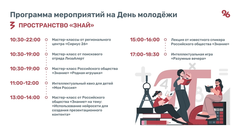 На площадке «Знай» для юных ставропольцев проведут мастер-класс от поискового отряда «ЛизаАлерт» (16+). Там расскажут, как работают волонтёры, как правильно оказывать медпомощь в экстремальных ситуациях, а также познакомят с тем оборудованием, которое используют поисковики. Также здесь пройдёт лекция от известного спикера Российского общества «Знание» (16+). Какие ещё мероприятия подготовили для гостей этой локации, смотрите в инфографике.