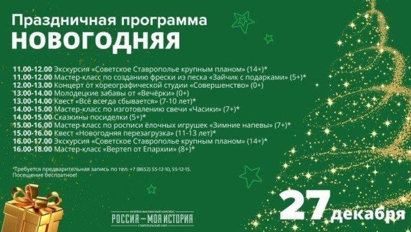 27 декабря с 11:00 до 18:00 в музее «Россия — Моя история» пройдёт семейный фестиваль «Новогоднее настроение». В программе будут экскурсии, мастер-классы, игры и квесты. Расписание фестиваля и возрастные ограничения указаны на афише музея «Россия — Моя история». На некоторые мероприятия требуется запись: 8 (8652) 55-12-15.