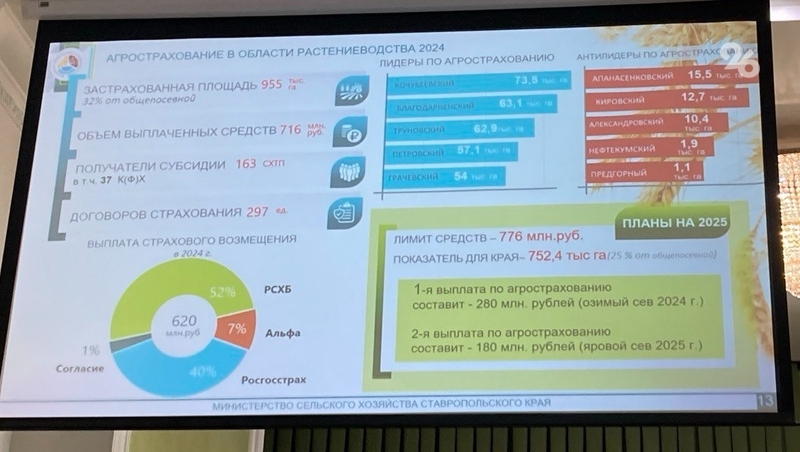 Возместить часть этих потерь сельхозпроизводителям помогут механизмы агрострахования. В крае застрахован почти 1 млн га площадей, на 2025 год на эти цели выделены 776 млн рублей. Первые 280 млн получателям переведут в ближайшую неделю, оставшиеся средства будут выплачивать по мере заключения страховых договоров. Лидеры по застрахованным площадям в крае — Кочубеевский, Благодарненский, Труновский, Петровский и Грачёвский округа. В аутсайдерах — Апанасенковский, Кировский, Александровский, Нефтекумский и Предгорный округа.