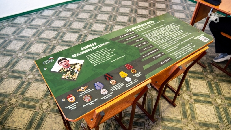 В школе, где учился Мухамбет Ажимов, первая парта Героя была открыта в его честь. Здесь его любят и уважают. Атаман позаботился о том, чтобы на территории школы построили полосу препятствий для детей. А в здании — открыли музей боевой славы, где почти каждый экспонат лично знаком прапорщику Ажимову.