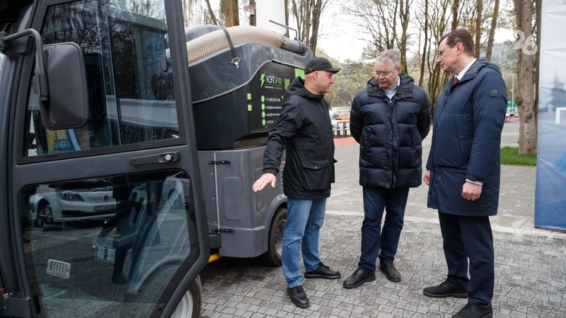 Здесь же Владимиру Владимирову представили уборочные машины на электротяге, которые сейчас тестируют в Кисловодске. Электрокары могут работать без зарядки шесть-семь часов. В комплектацию входят пять базовых навесных насадок для разного вида уборочных работ. Во время тест-драйва машины применяют для очищения городских пространств.