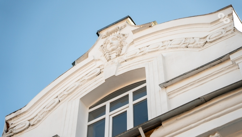 Этот фасад сохранил свой первозданный вид. Здесь стены украшает выразительная лепнина, а крышу — аттик (декоративная стенка над карнизом).