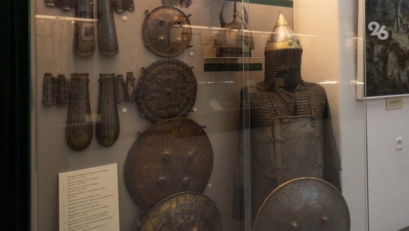 В одной из витрин — панцирь XIX века. От кольчуги он отличается тем, что колечки соединены маленькими шипами. Собеседница заметила, что такие вещи на Кавказе не создавали, а закупали в Турции и Персии.