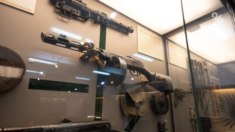 В экспозицию вошло и огнестрельное оружие, помогавшее советским солдатам в борьбе с врагом. Так, можно увидеть винтовку Мосина, пистолеты-пулемёты систем Дегтярёва, Судаева, Шпагина, револьвер системы Нагана, пистолет Токарева. Последним были вооружены все солдаты того времени.