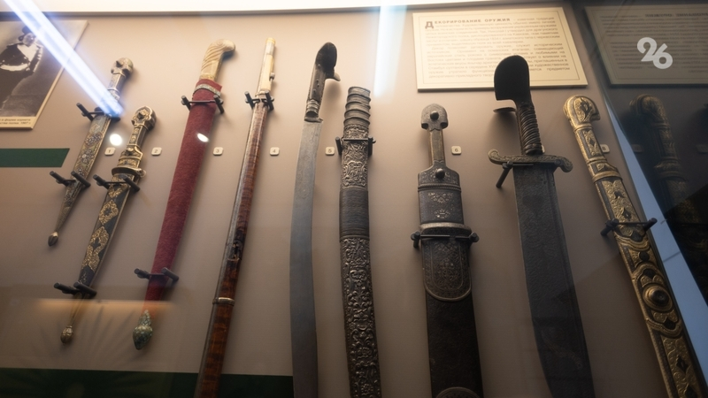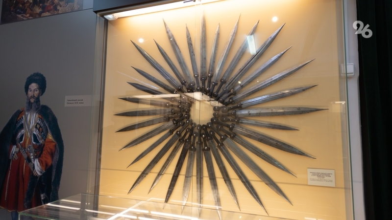 Экскурсия началась с демонстрации кинжалов горцев Северного Кавказа второй половины ХIХ века. По отдельности они, пожалуй, ничем не примечательны, но то, как сотрудники музея решили скомпоновать эту часть коллекции, впечатляет: из холодного оружия была собрана выразительная композиция «Звезда Кавказа».