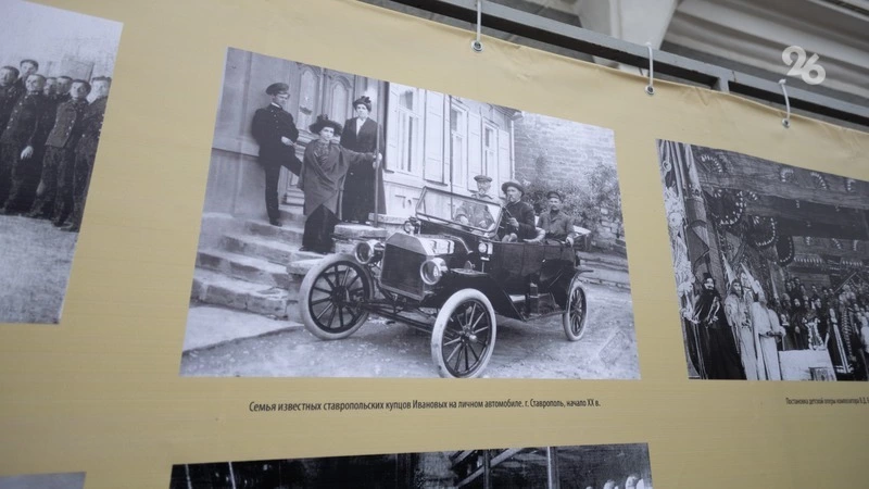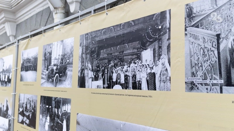Следующий стенд посвящён Ставрополю. Летом жители губернского центра наслаждались прогулками в тени аллей Воронцовской рощи, где функционировал «Зелёный театр» в виде музыкальной ракушки (сохранилось фото выступления симфонического оркестра), там же на открытых верандах пили чай из самовара. Значительный вклад в культурную жизнь Ставропольской губернии внёс учитель музыки и композитор Василий Дмитриевич Беневский — он герой следующего снимка.