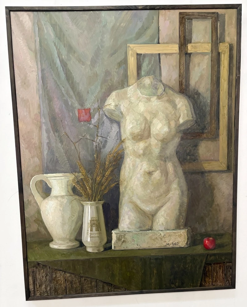 Гигантские полотна дополняют произведения, которые созданы в традициях реализма: натюрморты, портреты, деревянная скульптура. В их числе — холсты Анастасии Сурковой, самой юной участницы прошлогоднего межрегионального проекта «Живописная Россия. Искусство нашего времени».