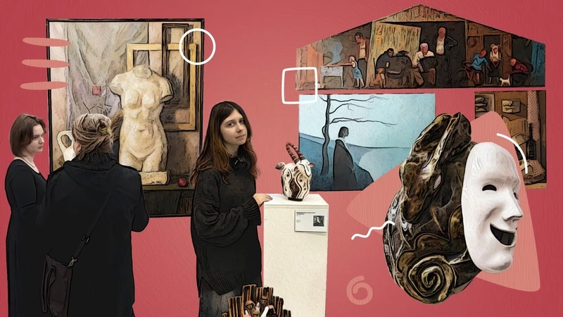На выставке много сюжетных полотен, изобретательных натюрмортов и картин, наполненных философскими смыслами. С ними соседствуют предметы декоративно-прикладного творчества.