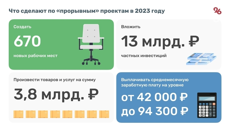 Так, в 2023-м по прорывным проектам власти ставят следующие цели: создать 670 новых рабочих мест; вложить 13 млрд рублей частных инвестиций; произвести товаров и услуг на сумму 3,8 млрд рублей; выплачивать среднемесячную заработную плату на уровне от 42 тысяч рублей до 94,3 тысячи рублей.