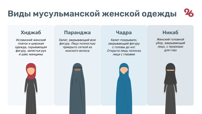 Хиджаб может быть небольшим, закрывающим лишь волосы и шею. Но встречаются и большие платки, больше напоминающие накидки. Нередко хиджабы путают с паранджой, чадрой и никабом. Но они существенно отличаются. Самый закрытый вариант — паранджа.
