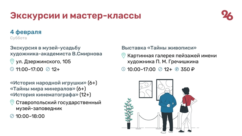 В субботу, 4 февраля, ставропольцы смогут посетить экскурсию по усадьбе художника-академиста Василия Смирнова (12+). В доме конца XIX — начала XX века можно увидеть мастерские и комнаты, в которых работал и жил художник. Также посетителям покажут сад, где располагается старинный сарай с голубятней и каморкой для хранения садового инвентаря. Дом располагается по адресу: улица Дзержинского, № 105.