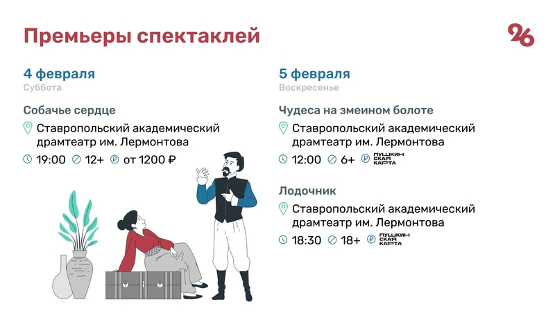 В воскресенье, 5 февраля, в 12:00 состоится премьера музыкальной детской сказки Ю. Кима «Чудеса на змеином болоте» (6+). Юные ставропольцы смогут посетить весёлую и увлекательную постановку, полную волшебства, юмора и чудес. Там будет всё: заграничные женихи, борьба за сердце возлюбленной и сражение со Змеем Горынычем. Билет можно приобрести по Пушкинской карте.