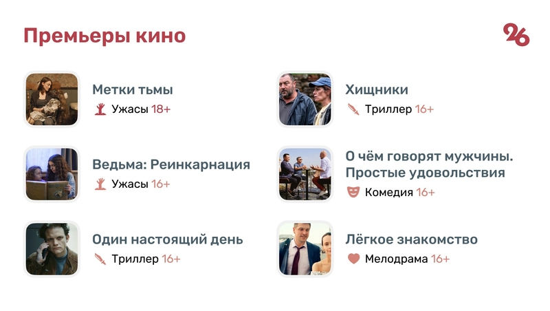 Так, в прокат вышли ужастики «Метки тьмы» (18+) и «Ведьма: Реинкарнация» (16+). По сюжету первого фильма режиссёра У. М. МакКалло молодая семья переезжает в новый дом, где начинают происходить жуткие вещи: дети видят странные метки, мать преследует кукла, напоминающая погибшую дочь, а в подвале образуются трещины. Чтобы спастись от проклятий, семья должна разгадать тайну места, на котором был построен дом.