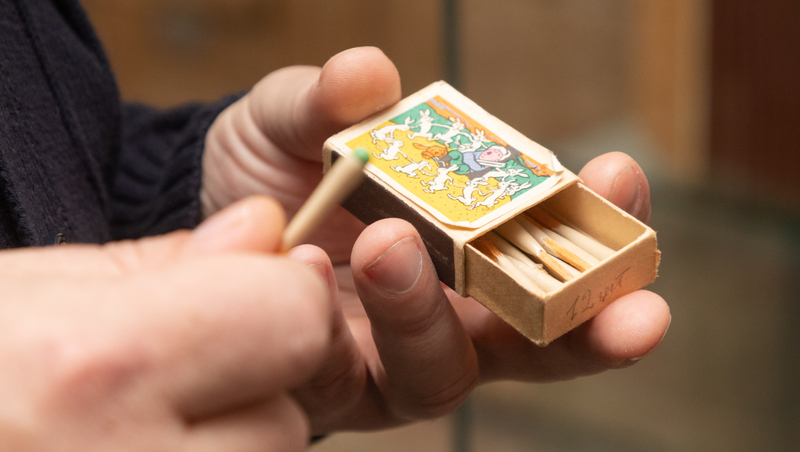 Есть немало разновидностей спичек: бытовые, сигнальные, охотничьи, каминные. Экспонаты, которые оказались в руках у Андрея Гордиенко — как раз из серии охотничьих. Они выпускались в СССР и были обязательным атрибутом снаряжения охотников, туристов и рыболовов, так как помогали развести костёр в экстремальных условиях. На коробках печатались цветные сюжетные изображения. Таких коробочек в музее всего пять. На четырёх изображены животные и птицы, на пятой — юмористический сюжет: пока охотник спит, обнявшись со своим псом, вокруг этой компании зайцы водят хоровод. Сами спички покрыты серным составом с зелёной головкой. Способ их изготовления немного отличается от традиционного, от этого горят они иначе. А ещё такие спички стоили всегда дороже — 1 рубль 60 копеек против обычных, за которые нужно было отдать несколько копеек. Продавались они в специализированных магазинах.