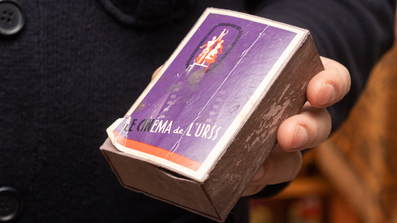 О другом важном событии из жизни страны напоминает спичечный коробок фиолетового цвета с надписью LE CINEMA de L’URSS («Кинематограф СССР»). Это единственная коробка из сувенирного набора, выпущенного в 1958 году Балабановской экспериментальной фабрикой специально к Всемирной кинематографической выставке в Брюсселе. Набор был посвящён кинофильмам СССР, состоял из 17 спичечных коробков, на которых изобразили героев фильмов «Садко», «Чук и Гек», «Старик Хоттабыч», «Отелло». Такие наборы дарили иностранным делегациям: футляр был небольшой по размеру, легко помещался в ручную кладь.