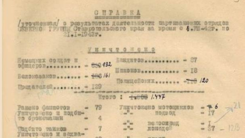 А вот цифры из справки о деятельности партизан Северной группы на Ставрополье. За период с августа 1942 года по январь 1943 года они уничтожили более 930 немецких солдат и офицеров, 129 предателей, 120 полицейских, 87 бандитов и 18 шпионов.
