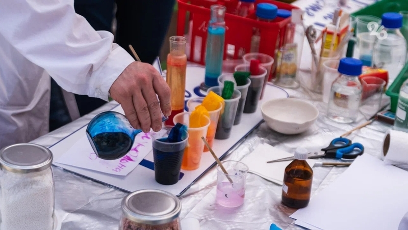 Настоящие чудеса происходили в локации, где собрались профессиональные химики. Сначала они нанесли на чистую бумагу надпись, которая через несколько секунд исчезла. Затем кисточкой с другим раствором провели по листу, после чего буквы вновь появились. Потом ребята сами делали «лаву» из цветной жидкости. А завершились фокусы так называемым светофором —волшебным превращением жёлтой жидкости в красную, а затем в зелёную. Удивлённым зрителям специалисты объяснили, как повторить такие опыты дома.