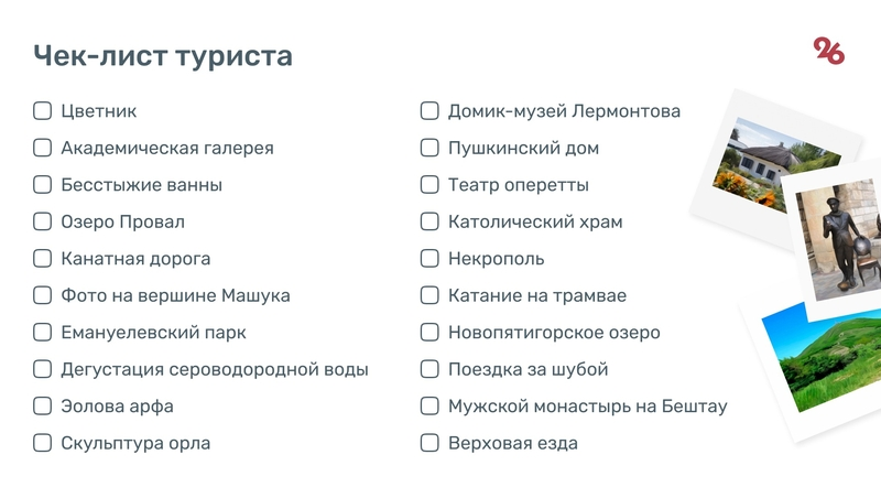 «Пятигорск популярен у отдыхающих круглый год. Чаще всего обращаются за организацией туров на неделю. Номер на одного взрослого в трёхзвёздочном санатории с полным пансионом и оздоровительными процедурами можно снять за 26,5 тысячи рублей. Двухкомнатный люкс в четырёхзвёздочном санатории с питанием и лечением обойдётся от 71,6 тысячи рублей. Часто останавливаются в бизнес-отеле в посёлке Иноземцево — оттуда недалеко и до аэропорта, и до Пятигорска. Двухместный номер без питания стоит от 34,8 тысячи рублей»,