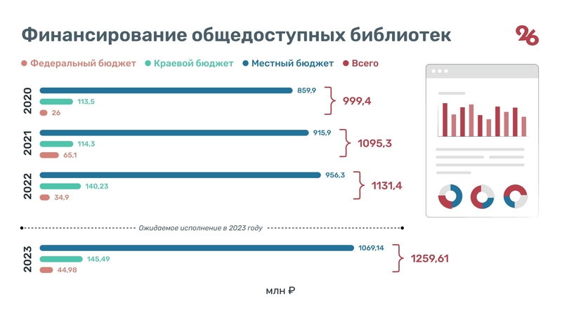На финансирование общедоступных библиотек выделяют немалые суммы из государственного бюджета, которые растут с каждым годом. В 2023-м, например, на развитие учреждений планируют направить свыше 1,2 млрд рублей, где более 145 млн — деньги краевой казны. Работу в этом направлении курируют региональные министерства образования и культуры.