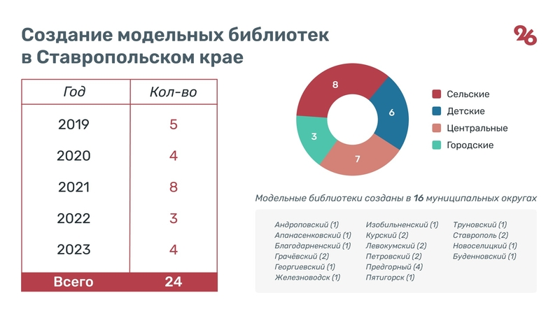 Сейчас на Ставрополье работают 24 модельные библиотеки в 21 населённом пункте. Этой осенью открыли ещё три подобных учреждения.
