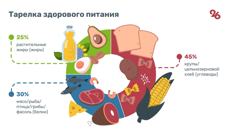 «Эксперты в области снижения веса говорят о тарелке здорового питания. То есть 45% от того, что мы едим, должны составлять медленные углеводы с низким гликемическим индексом: крупы, цельнозерновой хлеб, 25% — полинасыщенные, т. е. растительные жиры, 30% — белки, т. е. мясо, рыба, птица, грибы либо фасоль. Рекомендуется полный или частичный отказ от алкоголя»,