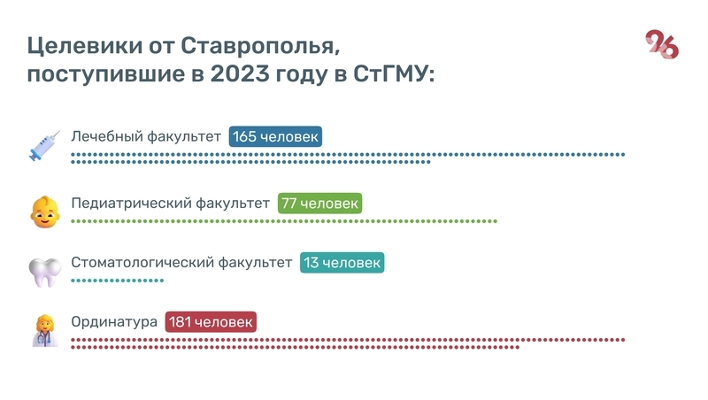 Всего же в этом году, по данным ведомства, для Ставропольского края правительство установило квоту по целевому набору на получение высшего образования в 470 мест: 262 — на специалитет и 208 — в ординатуру. На 2023–2024 учебный год в образовательные учреждения страны зачислили 453 ставропольца-целевика: 262 по общему направлению и 191 — в ординатуру. Из них 436 поступили в СтГМУ.