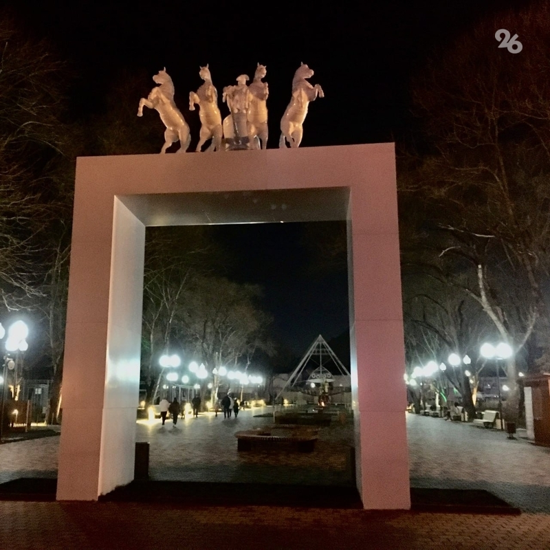 Городской парк в Минводах небольшой, там можно погулять с ребёнком. В парке есть детские площадки и аттракционы, в том числе колесо обозрения. На входе — скульптурная композиция с конями, вероятно, отсылающая к знаменитому фонтану на Манежной площади в Москве.
