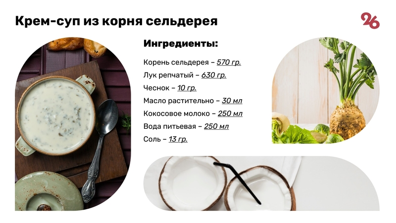 Для приготовления этого супа нужно порезать лук кубиками, а чеснок раздавить. Поместить всё в сотейник с растительным маслом и поставить томиться до прозрачности лука. Корень сельдерея тоже порезать кубиками, добавить к луку и чесноку. Далее влить овощной бульон или воду в сотейник и варить 10–15 минут. После нужно добавить кокосовое масло, посолить и варить ещё 5–7 минут на медленном огне. Остудить, пробить в блендере до кремообразного состояния.