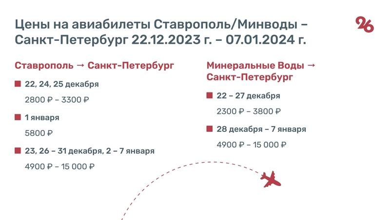 В Санкт-Петербург из Ставрополя 22, 24 и 25 декабря билеты пока что стоят от 2800 до 3300 рублей, 1 января — 5800. В остальные дни — от 4500 до 17 100. Из Минвод с 22 по 27 декабря — от 2300 до 3800 и с 28 декабря по 7 января — от 4900 до 15 000 рублей.