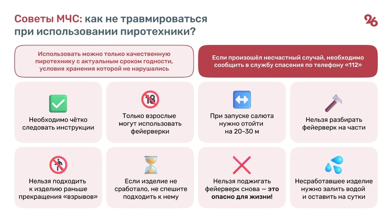 «В руках неподготовленного человека пиротехника может повести себя непредсказуемо, особенно, когда изделие становится неустойчивым и опрокидывается. Можно получить серьёзные ожоги и травмы. Также фейерверк может попасть в здание и вызвать пожар»,