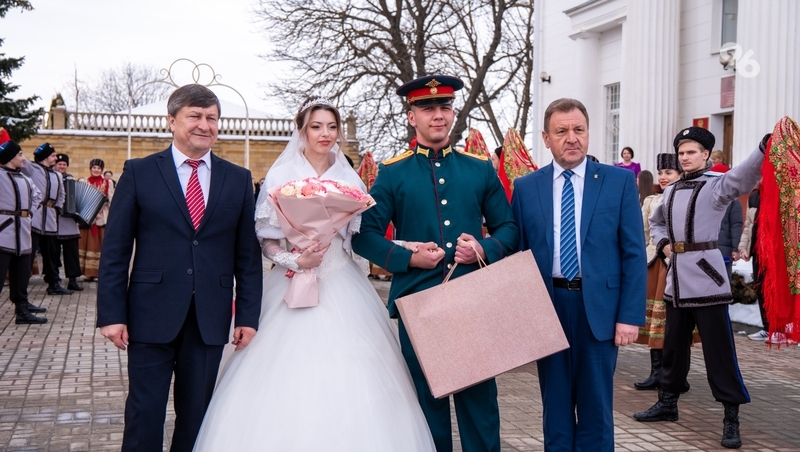 После церемонии для молодожёнов выступили казаки. Также пару поздравил глава Ставрополя Иван Ульянченко.