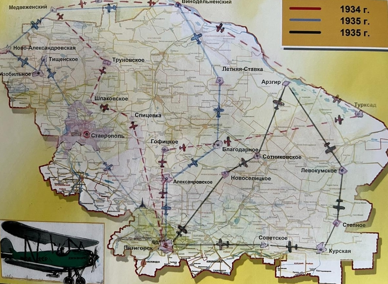 География полётов ставропольских пилотов в середине 1930-х годов чем-то напоминает современную сеть автобусных перевозок: из Пятигорска через Благодарное и Александровское выполняли рейсы в Летнюю Ставку, а затем через Дмитриевское, Труновское, Шпаковское, Спицевку возвращались в курортный город.