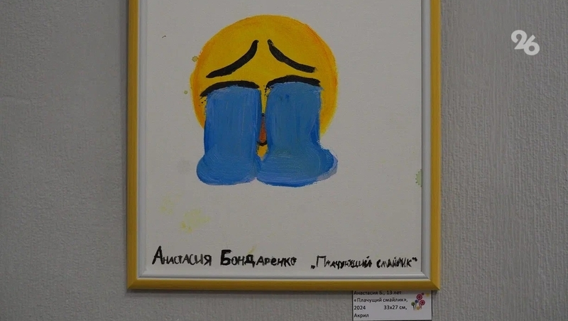 Небольшая экспозиция на неделю разместилась на первом этаже. Это несколько работ, нарисованных во время арт-терапевтической работы воспитанниками михайловского Психологического центра. Там дети и подростки с ментальными особенностями творческими методами учатся понимать чувства и эмоции, свои и других людей.