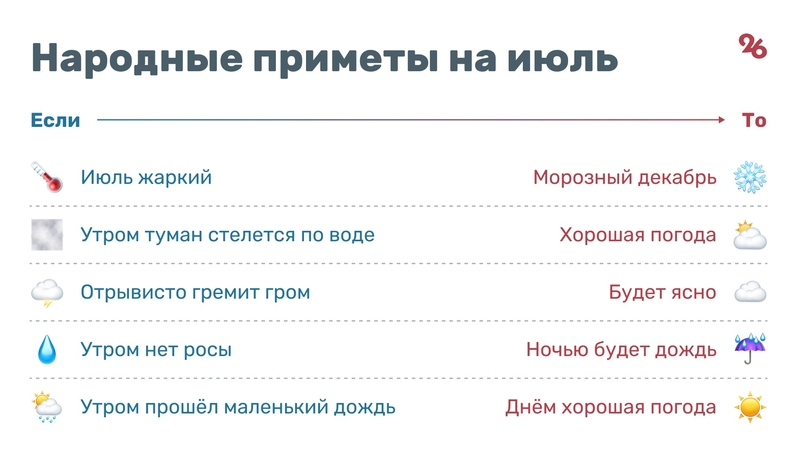 Ясных дней в июле будет 19. Самые жаркие из них — 25 и 26 числа — +30 градусов. Ещё 11 дней второго летнего месяца будут с длительными осадками и один — с переменной облачностью.