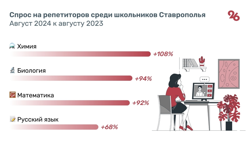 Спрос на репетиторов ощутимо растёт на Ставрополье. По данным «Авито», в преддверии нового учебного года по сравнению с августом 2023 года спрос на них увеличился на 36%. Самыми востребованными остаются преподаватели математики, русского языка, химии, биологии и физики.