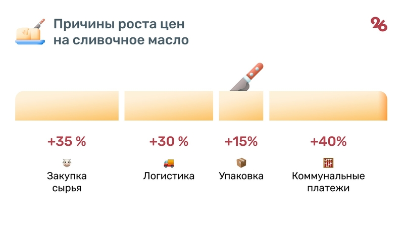 На эти же причины подорожания масла указывают и сами производители. Так, директор по продажам молочного комбината «Ставропольский» Сергей Дутов рассказал, что «всё выросло — и логистика, и оборудование, и упаковка, и другие расходники, но главным образом — сырьё».