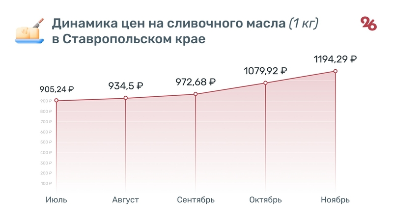Стоимость килограмма масла на полках ставропольских магазинов выросла с начала текущего года на 40% и составляет 1177 рублей за килограмм, сообщили в минэке. Эти данные подтверждаются и данными недельного мониторинга Северокавказстата за период с 12 по 18 ноября 2024 года — 1177,85. Свежие же данные, с 19 по 25 ноября, свидетельствуют о том, что килограмм масла стоит уже 1194,29 рублей за килограмм.