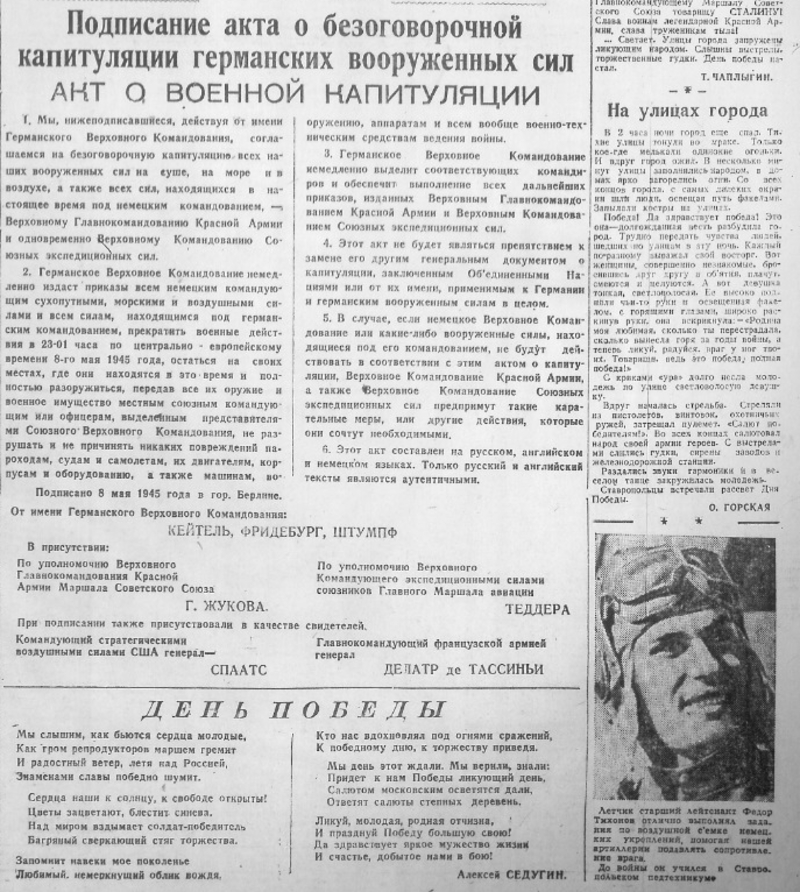 Тексты этих документов занимали первые полосы ставропольских газет. В городских и районных изданиях к ним добавили описание реакции ставропольцев на долгожданное известие об окончании войны и заметки о будничных заботах.