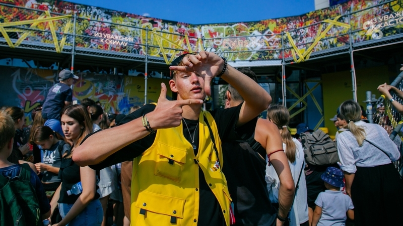 На брендированной арт-зоне Билайна самой яркой была площадка для творчества. Огромную двухъярусную стену любой желающий мог самостоятельно расписать граффити.